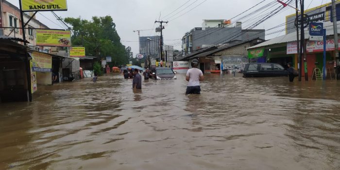 Pantauan di lokasi, tepatnya di depan Perumahan Ciledug Indah, Kelurahan Pedurenan, Kecamatan Karang Tengah, Kota Tangerang, ketinggian air di jalan raya mencapai ketinggian 80 cm.
