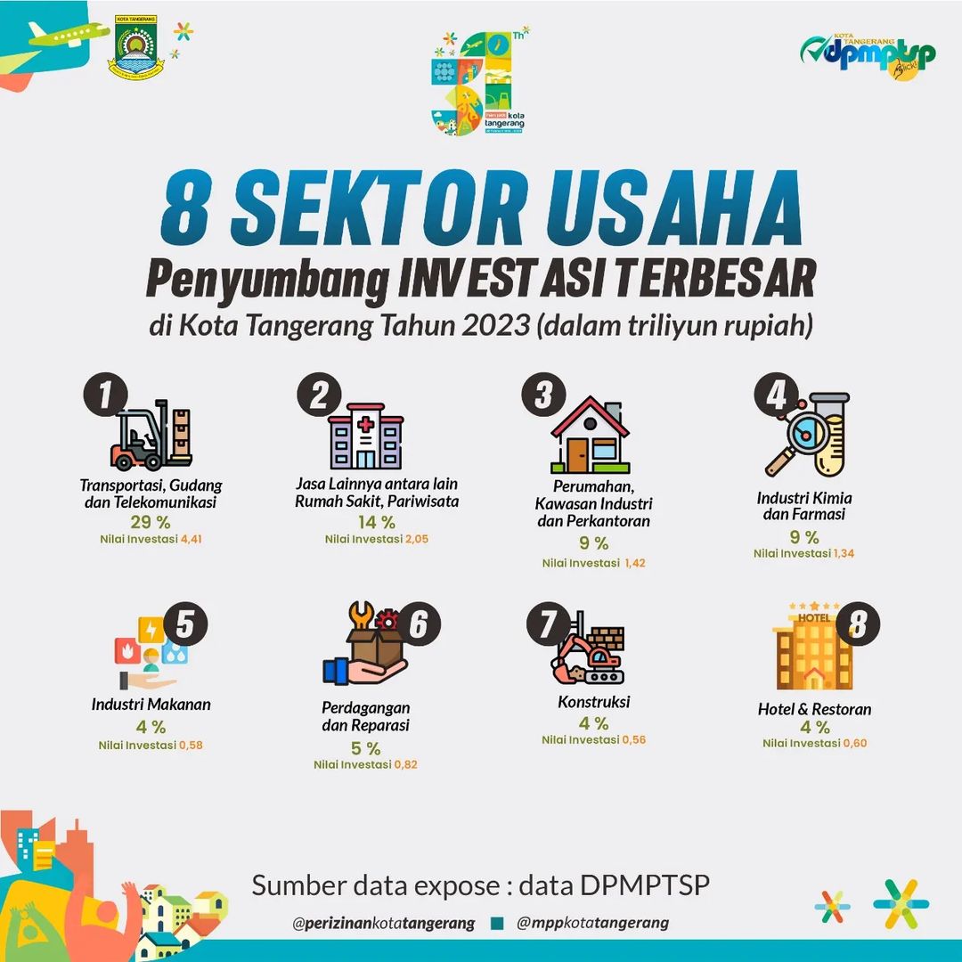 Delapan sektor usaha menjadi penggerak utama pertumbuhan investasi di Kota Tangerang sepanjang 2023. Hal ini menunjukkan optimisme investor terhadap perkembangan Kota Tangerang.