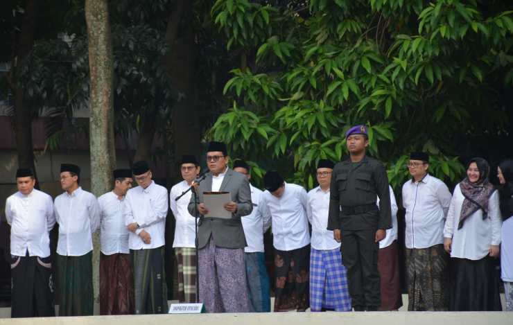 Mengenakan sarung, jas dan kopiah hitam, Prof Asep pun menyampaikan amanat dari Menteri Agama (Menag) Prof Nasaruddin Umar. Dalam amanatnya yang dibacakan Prof Asep, Menag menyampaikan belasungkawa terhadap insiden di Pondok Pesantren Al-Khoziny, Sidoarjo, Jawa Timur.