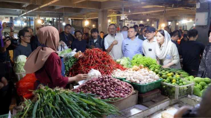 Wakil Wali Kota Tangerang Selatan (Tangsel) Pilar Saga Ichsan mendampingi Wakil Menteri Perdagangan (Wamendag) Republik Indonesia (RI) Dyah Roro Esti melakukan pemantauan harga kebutuhan pokok di Pasar Ciputat, Jumat (6/3/2026).