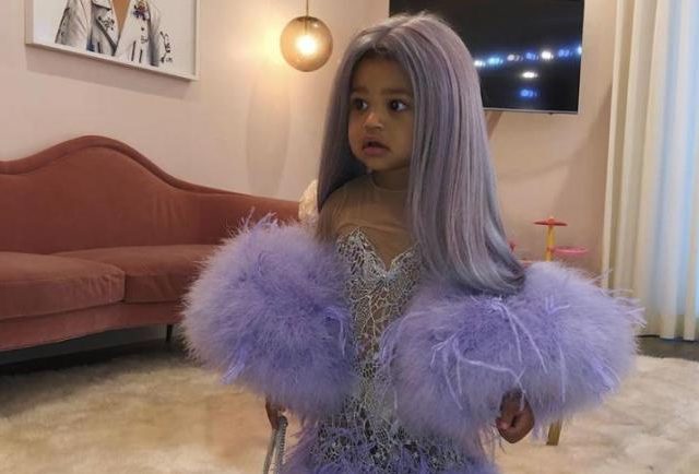 Stormi mengenakan replika Versace head-to-toe lilac yang terkenal. Ia juga memakai gaun putri duyung versi mini seperti yang dikenakan oleh Kylie di MET Gala pada bulan Mei tahun ini.